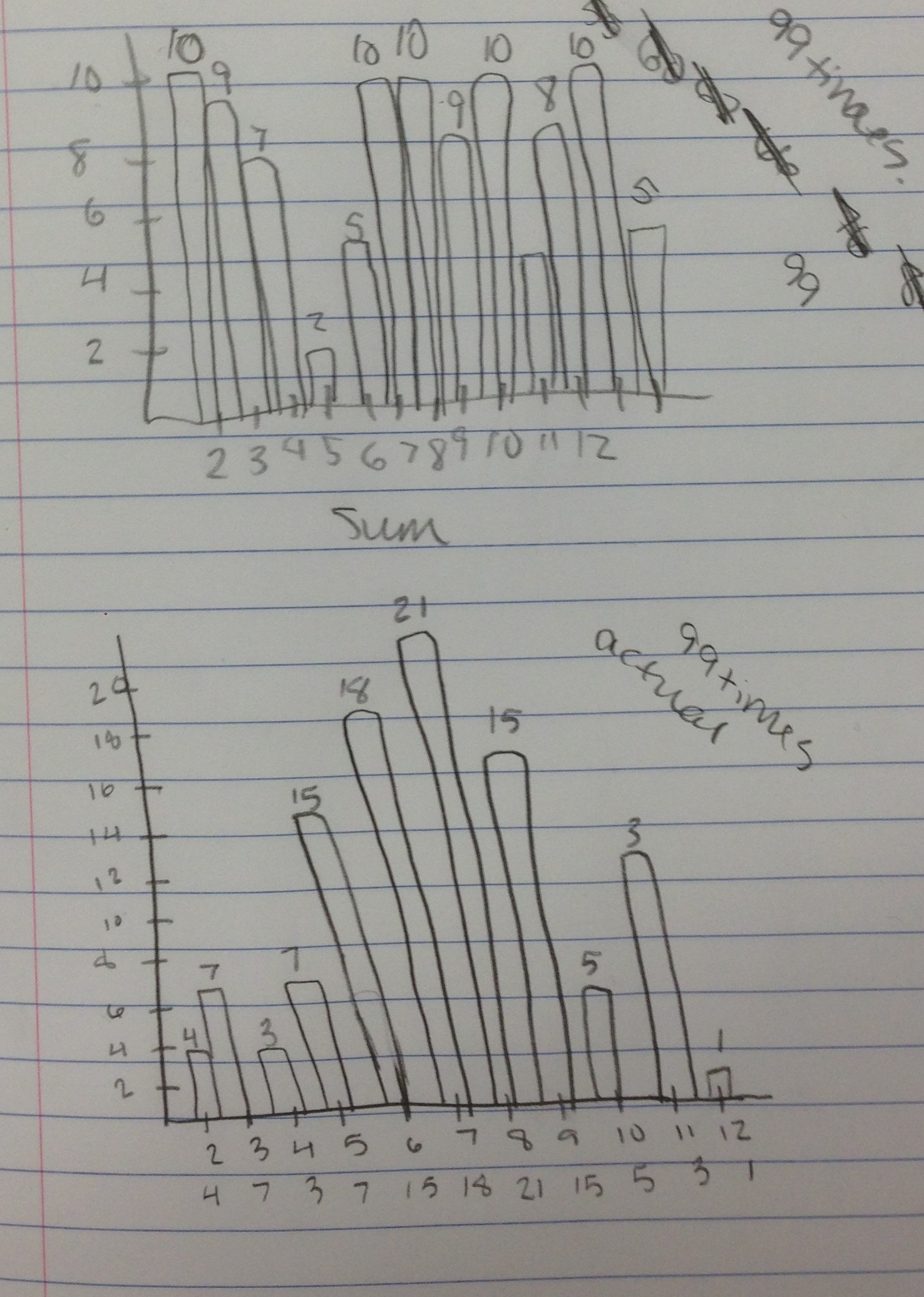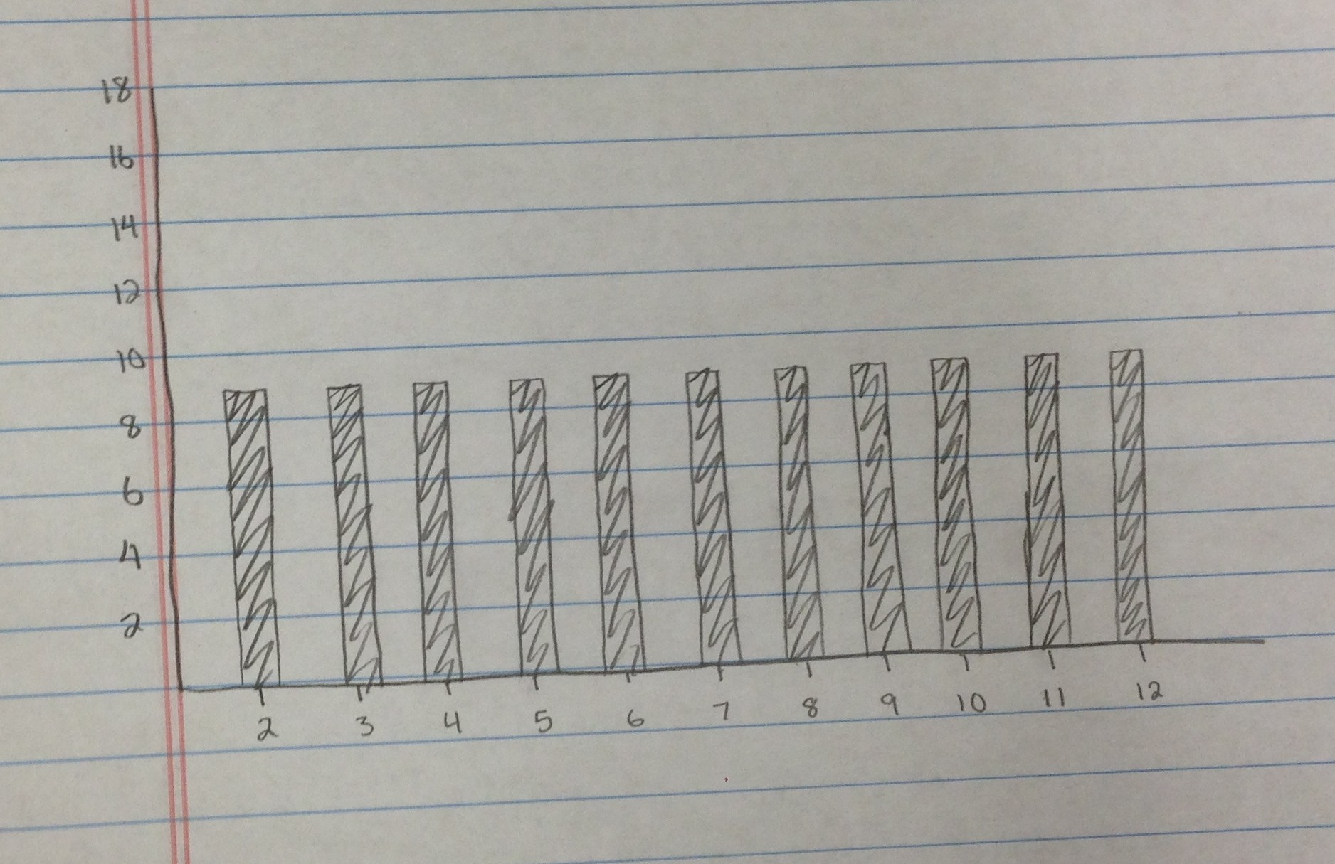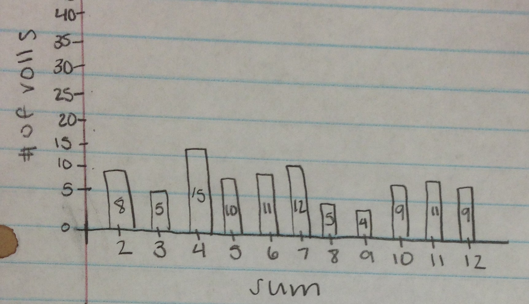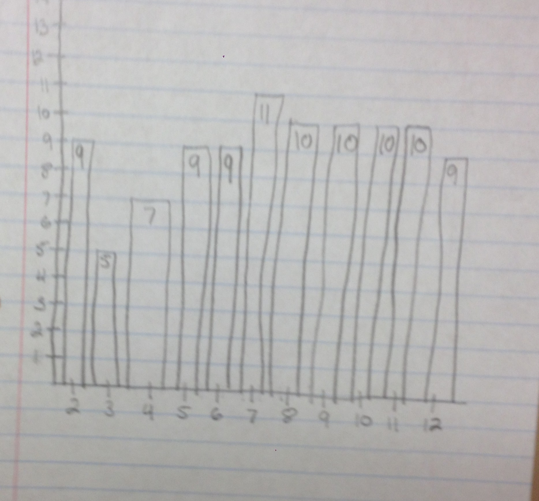 I ask the kids if there are any other strategies for their predictions other than the ones we have discussed. One student added that maybe 2 would show up least often and 12 the most, increasing in between. Discussion ensued.