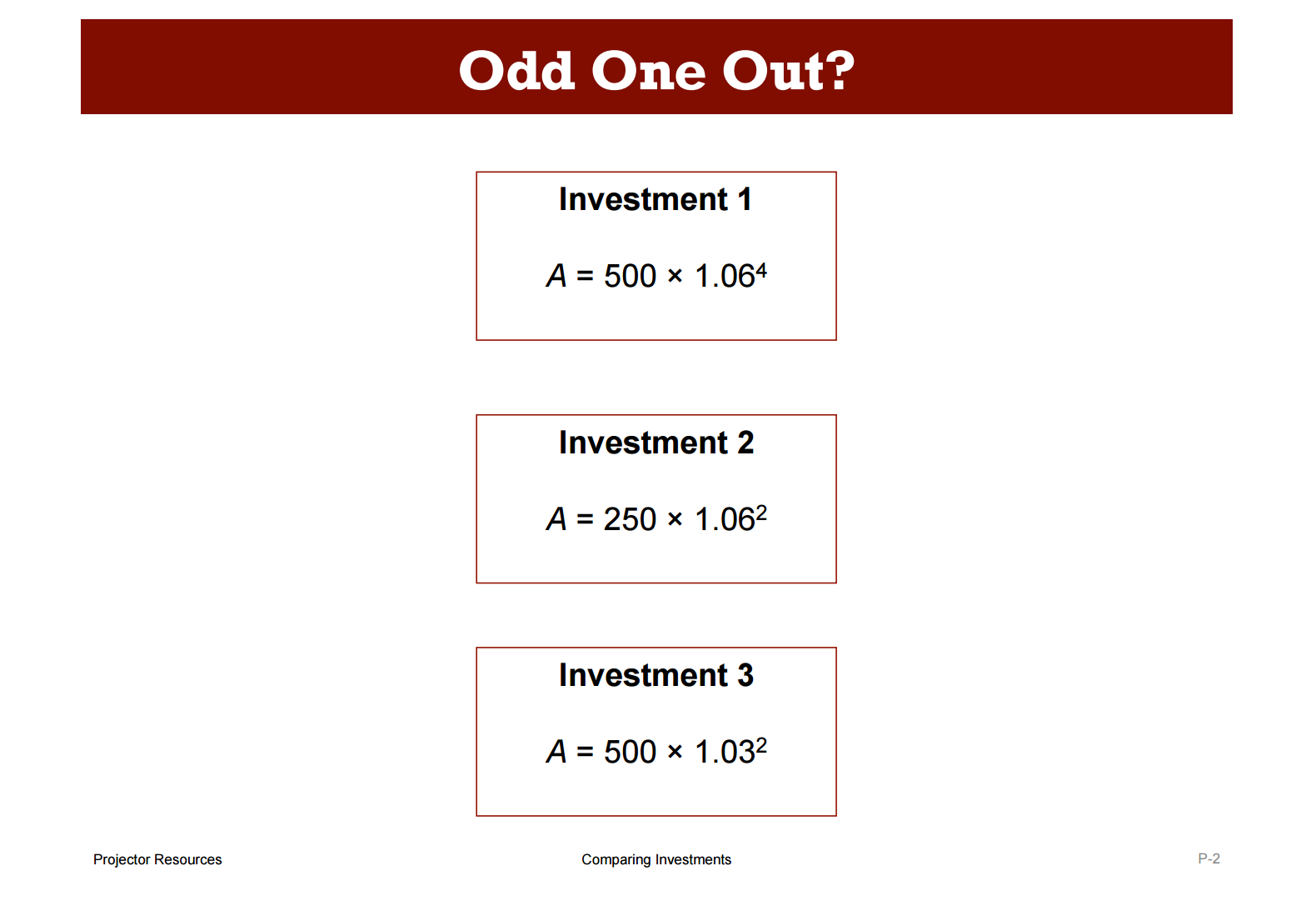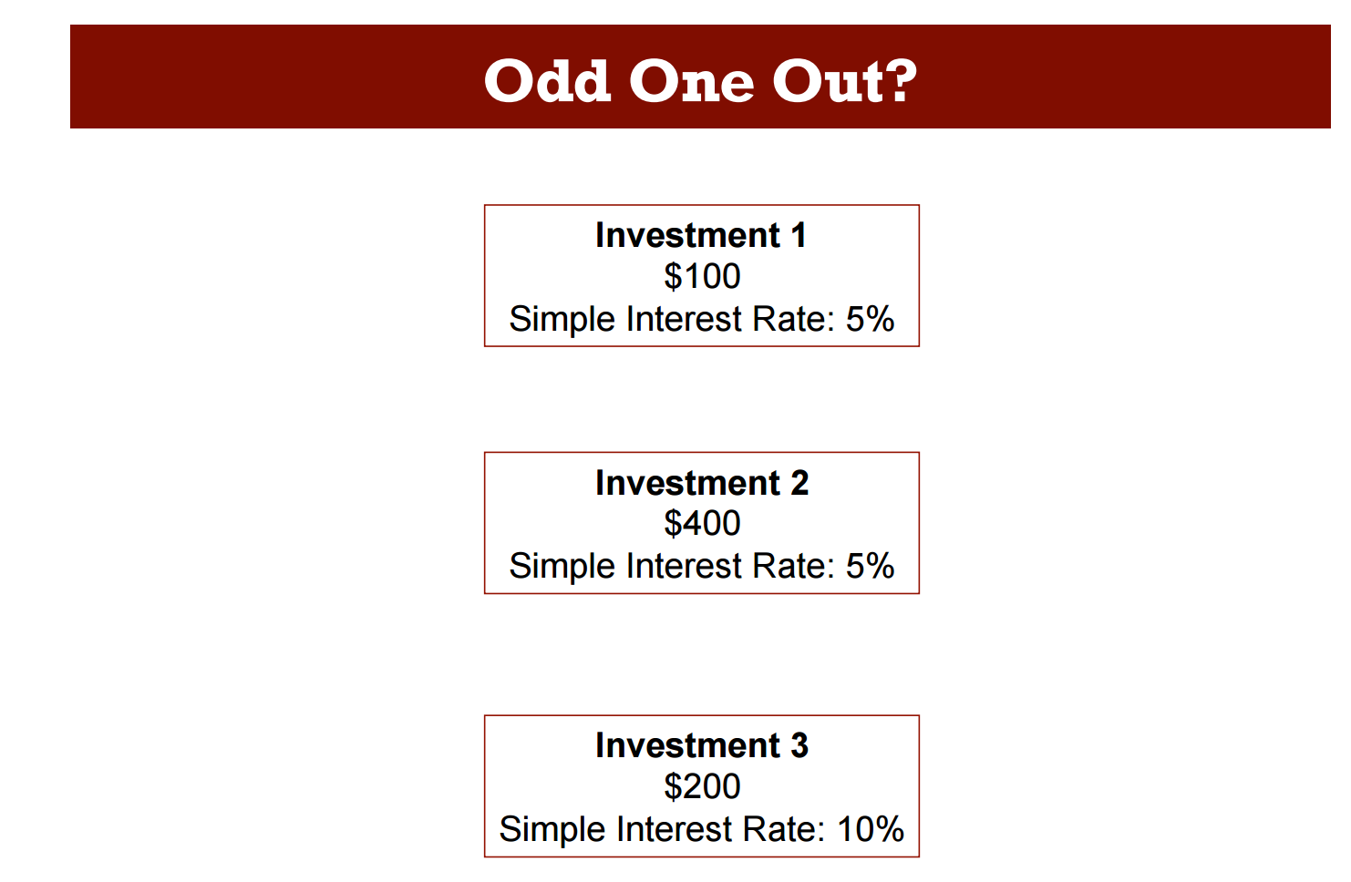 My assumption, not being familiar with this group of kids, was that they’d go right for the obvious – Investment 3 is the odd one out because it has a 10% interest rate and the others have a 5% interest rate. I underestimated them. They came up with very creative, thoughtful reasons why each investment could be considered the odd one out. I really like these questions because all three can be correct, and students have an opportunity to defend multiple answers.